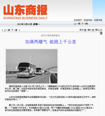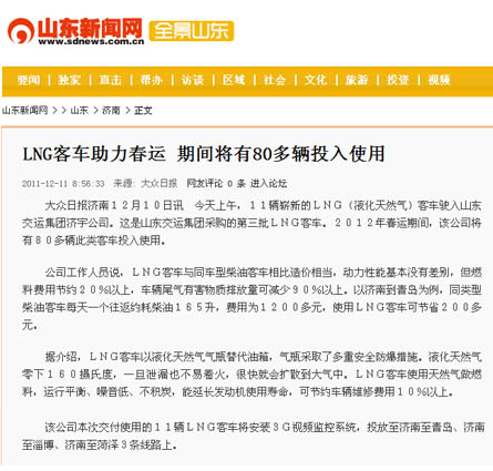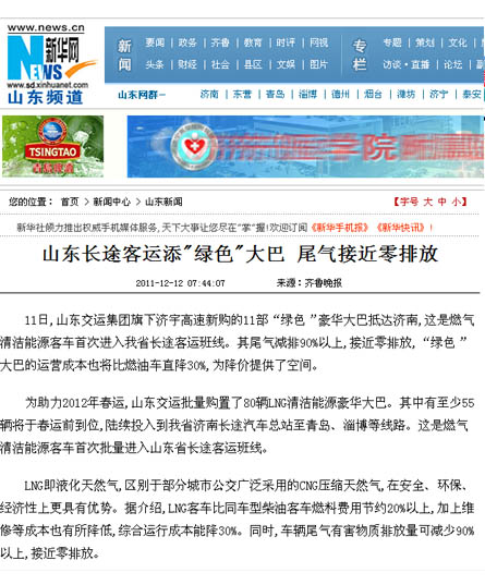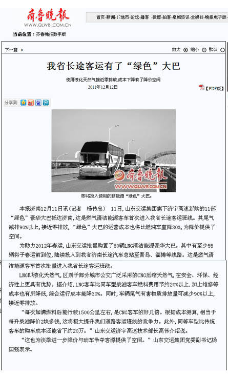 12月6日—9日,集团公司组织了以“山东交运集团80余部燃气清洁能源环保客车助力春运”为主题的联合新闻采访活动。山东电视台、济南电视台、《大众日报》、《齐鲁晚报》、《现代交通报》、《济南日报》、《济南时报》、《交通广播》等8家新闻媒体纷纷派出记者组成联合新闻采访团,对集团公司本次购进燃气清洁能源环保客车工作,从环保、节能、安全等方面,以关注民生、行业发展、春运动态等角度进行了深入采访。