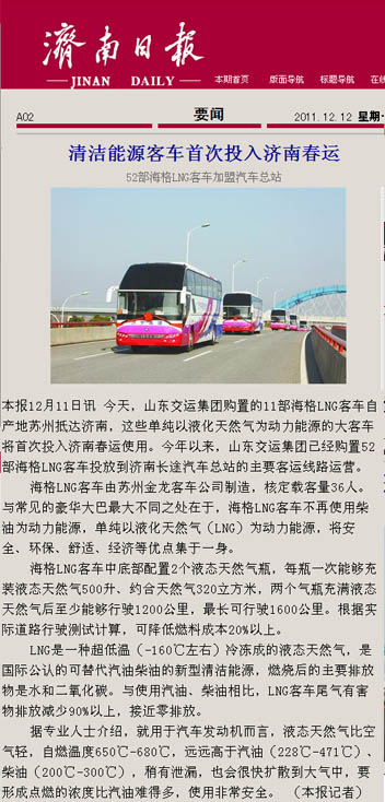 在采访活动中,采访团深入苏州金龙客车制造车间,观看了车辆从车架组装、整车阴极电泳到制动配制等流水制造的全过程,体验了客车制造的严密工序;在金龙客车厂产品展室,记者们了解了苏州金龙客车厂的发展历史及企业安全文化,对燃气清洁能源客车所应用的新技术、新工艺、新材料有了更进一步的认识;在苏州金龙客车厂会议室,总工程师张卫林将燃气清洁能源客车与汽油、柴油等能源客车进行比对,向记者详细介绍了燃气清洁能源环保客车在安全、环保、节能等方面的优势;在“山东交运集团清洁能源环保客车交车仪式”上,各新闻媒体记者又对本次燃气清洁能源环保客车车辆安全运营、节能减排、线路投放等情况,进行了现场采访和随行拍摄。12月9日晚22点,集团公司燃气清洁能源环保客车车队经一路跋涉平安抵济,12月10日晚,省电视台山东卫视频道在《新闻联播》栏目、济南市电视台济南新闻频道在《济南新闻》栏目以及《大众日报》、《齐鲁晚报》、《山东商报》、《生活日报》、《现代交通报》、《济南日报》、《济南时报》、《交通广播》等媒体都对集团公司燃气清洁能源环保客车投入春运情况进行了重点报道。