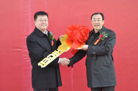 山东省交通运输集团有限公司党委副书记杨国强(左)和江苏金龙客车有限公司党委书记、新能源客车公司总经理谢飞鸣在交接现场。