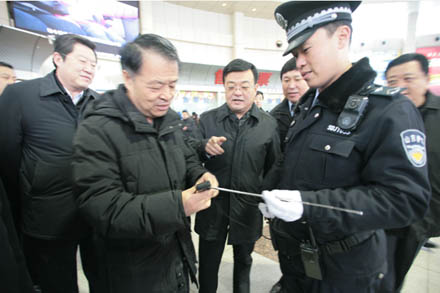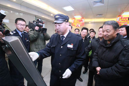杨传堂部长特别叮嘱车站工作人员说:“安全检查是车站服务的第一道关口,要充分利用人防、物防、技防等综合手段加强关口职能到位,要牢固树立安全第一的观念,确保旅客乘车安全?!?