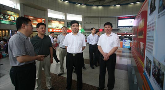 7月19日上午,山东省国资委党委副书记、纪委书记岳滨一行莅临集团公司调研指导工作。集团公司董事长吴宗昌、总经理王谦及部分领导班子成员陪同调研。期间,吴宗昌董事长汇报了集团公司基本概况和党建、党风廉政建设工作开展情况,岳书记在听取汇报后,与在座集团领导进行了深入座谈,并做重要指示。最后,岳书记一行来到济南长途汽车总站进行实地参观指导,与正在义务为旅客送水的十八大代表李文亲切交谈,并对总站女士售票窗口、人脸识别、3G视频监控等安全举措给予了高度评价和肯定。