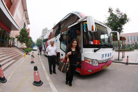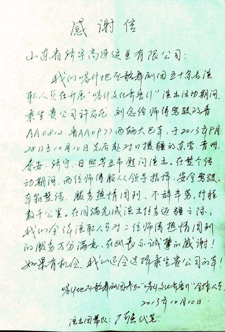 本次包车是受山东省援疆办委托,接送新疆“喀什文化齐鲁行”来访团成员共计90余人在省内各地汇报巡演。济宇高速商务中心作为省内唯一供车方,按照供车要求,派出三部豪华客车为来客提供全面优质服务。本次包车从济南出发,途径泰安、曲阜、济宁、东营、潍坊、日照、青岛七地,历经十三天。为顺利完成本次活动,全面展现齐鲁人民好客尚德的精神面貌,前期,公司专门召开部署会,要求驾驶员统一着装,佩戴白手套,服务中做到严格规范,热情有礼。活动过程中,车辆准时、设备完好、卫生整洁,给新疆朋友留下了深刻印象,受到了省委组织部的高度赞扬,离开之时,“齐鲁行”全体成员还特地请人代笔,留下了汉字版的手写感谢信。