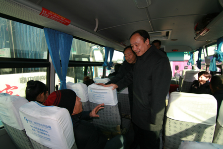 章丘市市委书记江林(右一)在章丘客运站临时站与乘客亲切交谈。
