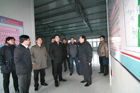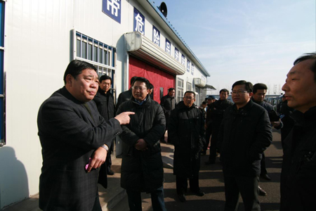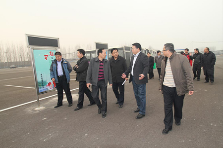 章丘市市长刘天东(左四)、副市长赵立元(左三)、交通运输局局长王键(左一)在山东交运集团副总经理田景东(右三)的陪同下,到临时站检查指导新站启用工作。