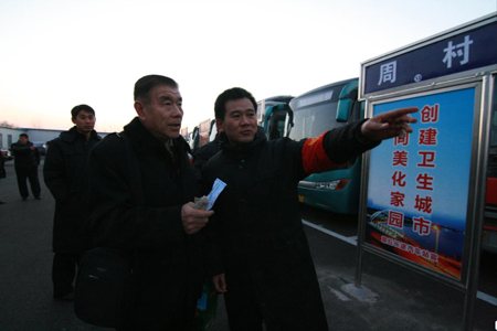济南市交通运输局运管办副主任崔建(左一)到发车场现场调度车辆营运工作。