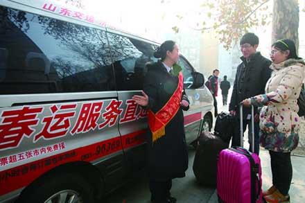 一是流动售票车“开”到家门口,直通车免费接到站。临近年底,由于工作繁忙,不少旅客无暇购买春运客票,总站推出了“春运流动售票车”,开进人流密集的商圈、企业、工地和学校,给广大旅客带来方便快捷的购票新体验。针对春运期间“老弱病残孕”等特殊旅客携带大量行李出行不便的问题,开通了“春运直通车”,凡购买5张客票以上并且有特殊需求的旅客,直通车开到旅客家门口,免费提供上门接站服务。二是班车服务门到门,返乡线路定制化。推出“春运班车门到门”特色服务,通过热线、网上预定等形式,在春运高峰期时段,根据旅客咨询较多的新汶、马站、高庄和莱钢等线路,计划出行人数超过30人的,直接安排预约车辆,真正实现返乡线路定制化。三是亲情服务细致入微,到站乘车如到家。设立了春运爱心送站港,配备阳光送站员,为“老弱病残孕”等旅客,提供“照看式”免费送站服务。总站热线开通了“春运顾问”咨询服务,总站官网设立了“春运顾问”版块,第一时间为旅客提供春运咨询服务,帮助旅客解决春运期间的票务问题。