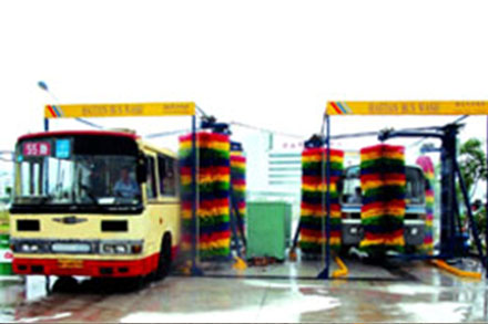 海天牌TH-350/450型大型通道式电脑洗车机专门为清洗中巴车、大客车而设计,采用通道式洗车方式,车辆由驾驶员自行慢速驶入机器清洗。四组毛刷分别清洗车辆的前后面和两侧面。清洗时由驾驶员配合操控。巴士快速洗车机可进行连续快速洗车,每小时最高达80辆,自动化程度高、洗车数量大、占地面积小。该机型目前主要应用于大型的客车停车站场,以平均每小时80辆的清洗速度作业,可满足集团公司匡山停车场1000辆客运车辆清洗作业的需求。