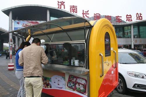 流动售餐车,开拓新市场。为不断扩大车站商贸经营规模,提高第三产业营业收入,多经办紧抓上班族及早班车旅客就餐难这一广阔市场,瞄准站前广场的有利位置,在经过长期、充分的市场调研后,于4月1日正式启动总站“家好快餐”流动售餐车,将餐车开到最显眼的站前广场导乘处,为广大旅客提供营养、卫生、实惠的早餐和午餐。“流动售餐车”上多种多样的餐品不仅受到了广大旅客及上班族的热情欢迎,更为总站增加了新的效益增长点,仅开业两天的营业额就达到一千余元,最大程度地发挥了总站区位和客流优势。