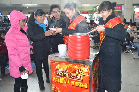 您现在的位置是:首页 > 客运场站产业 总站腊八粥,温暖回家路 次 客运场站产业 发布时间:2016-01-26 15:20:28 总站腊八粥,温暖回家路 1月17日是中国传统佳节腊八节,民间一直流传着喝“腊八粥”的习俗,为了让奔波在外的旅客在节日来临之际喝上热气腾腾的腊八粥,总站员工一大早就开始准备各种原料,精心熬制。上午9点,将寓意祝福的腊八粥运到候车大厅,邀请广大旅客免费品尝,总站领导为旅客盛粥、送粥,表达祝福。欢乐的节日气氛引来众多旅客驻足,美味的八宝粥受到广大旅客的欢迎和称赞。 (总站宣)