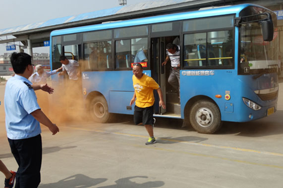 6月28日上午9时,随着平阴客运中心院内突然传来一声爆炸声,模拟停车场班车发生火情,一阵黄色的烟雾从公交车底散出。工作人员第一时间用灭火器灭火并输散旅客和车辆,同时迅速通知消防队及救援人员火速到达现场处理后续事宜,力争将损失降至最低。