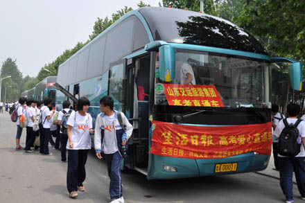 您现在的位置是:首页 > 旅游及新产业 好运旅游爱心高考车为考生护航 次 旅游及新产业 发布时间:2012-06-12 18:33:26 好运旅游爱心高考车为考生护航 每年高考都是社会关注的焦点,旅游集团抢抓市场机遇,在“好运旅游直通车”大品牌的带动下,与《生活日报》联合,适时推出了“高考爱心直通车”。6月8日,四部技术状况、安全性能俱佳的“高考爱心直通车”,将洪楼高中两百余名考生安全运达历城二中,为高考学子赶考开通了绿色通道,得到了广大考生和社会媒体的赞扬与关注。 (邱殷乐)